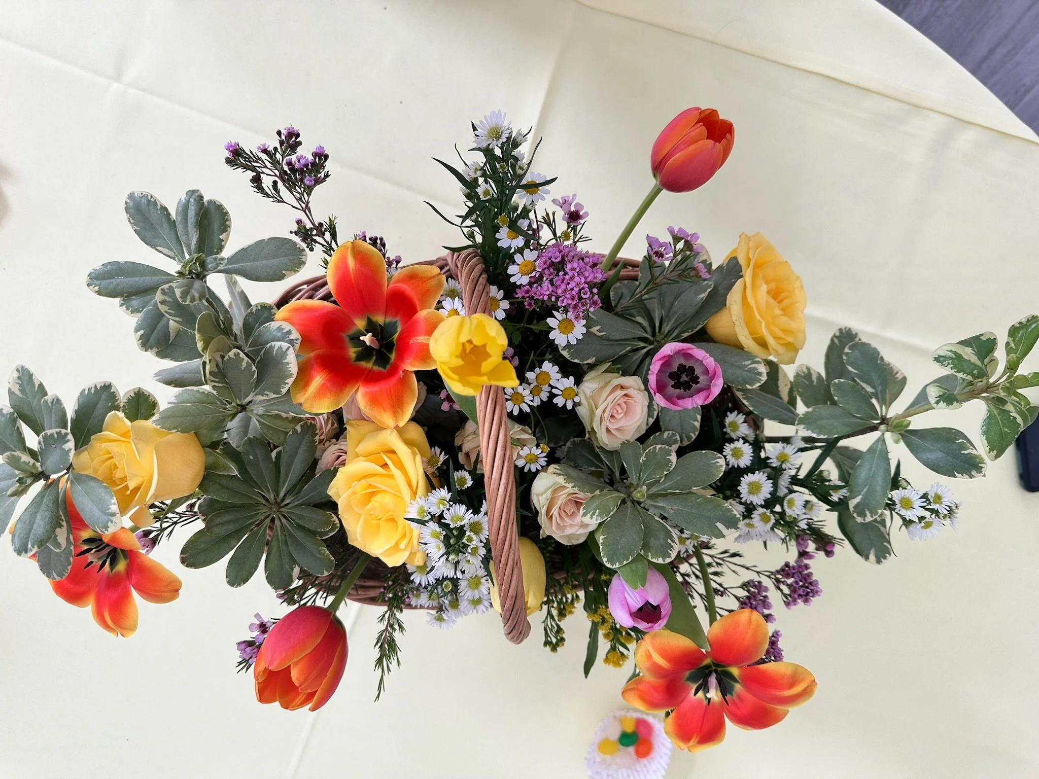 Colorful basket floral centerpieces for a spring baby shower in Norton, MA